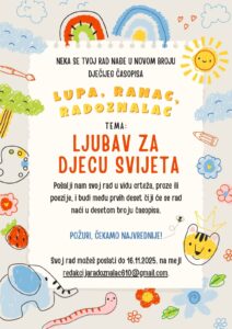 Draga djeco, pozivamo vas da učestvujete na konkursu za radove koji će biti objavljeni u novom broju našeg dječijeg časopisa „Lupa, Ranac, Radoznalac“!
