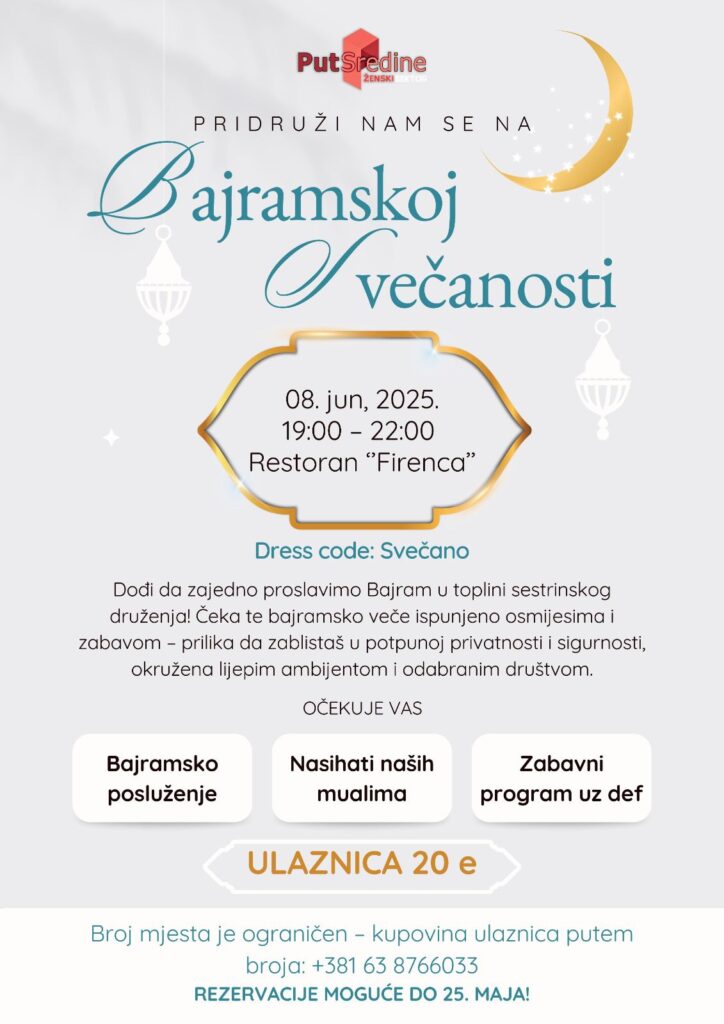 Sa velikim zadovoljstvom vas pozivamo na Bajramsku svečanost – večer ispunjenu radošću, ljepotom zajedništva i posebnim bajramskim ambijentom, osmišljenim s ljubavlju i pažnjom prema svakoj od vas.