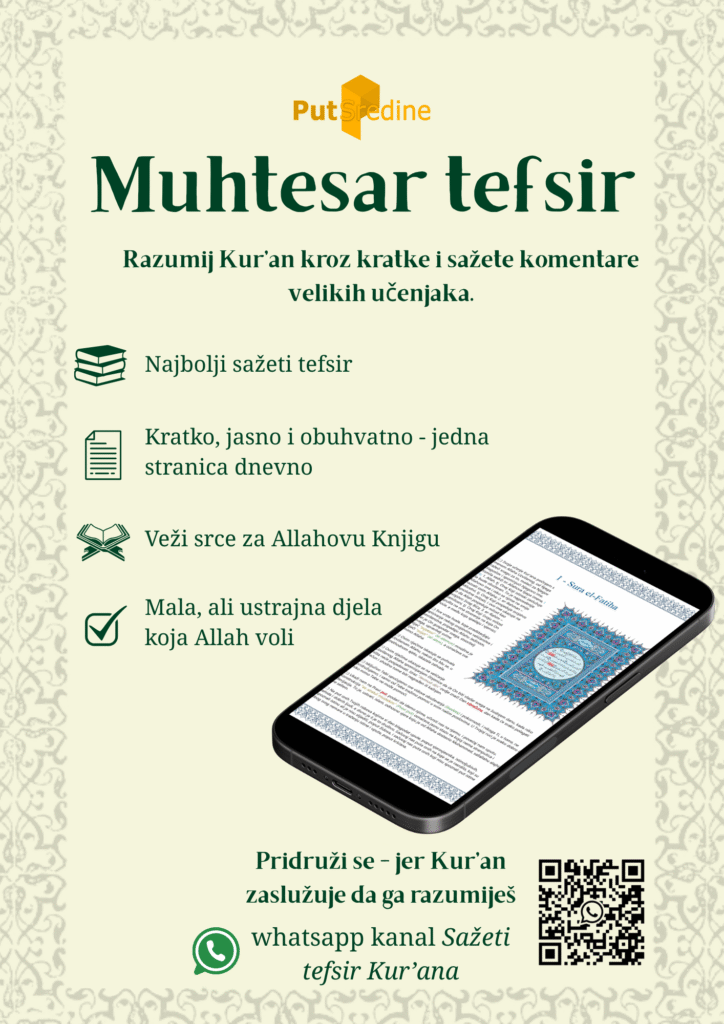 Muhtesar tefsir je poseban jer je kratak, jasan i obuhvatan, a sačinjen je na osnovu mnogih klasičnih tefsira i radova velikih učenjaka. Upravo zato je najbolji izbor za prvi ozbiljan korak u razumijevanju Kur’ana. Na našem WhatsApp kanalu svakog dana šaljemo samo jednu stranicu – taman onoliko koliko svako može da pročita i razmisli.