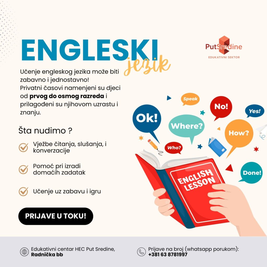 U Edukativnom centru HEC Put Sredine otvorene su prijave za časove engleskog jezika namijenjene djeci od prvog do osmog razreda osnovne škole. Program je osmišljen tako da učenje jezika učini zabavnim, interaktivnim i prilagođenim uzrastu djece.