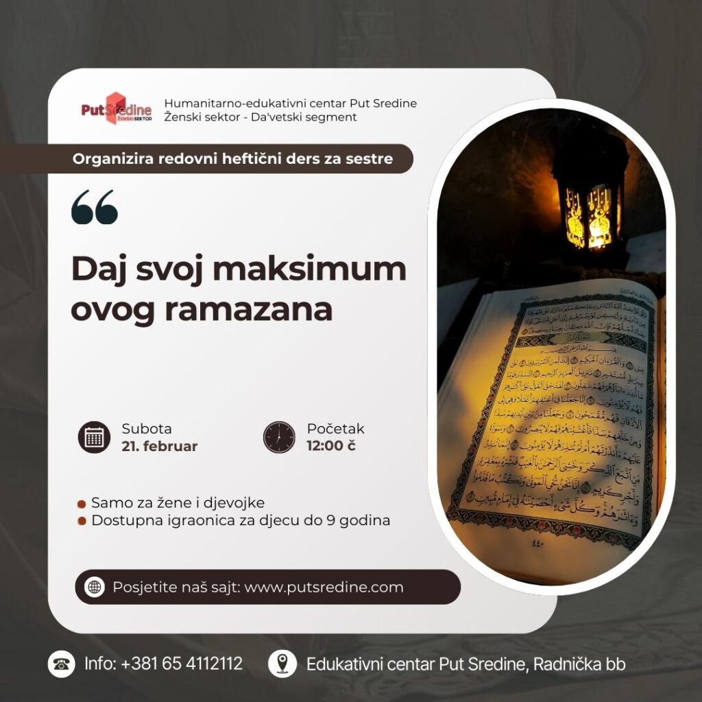 pozivamo vas na ramazanski serijal dersova u organizaciji ženskog sektora HEC Put Sredine.